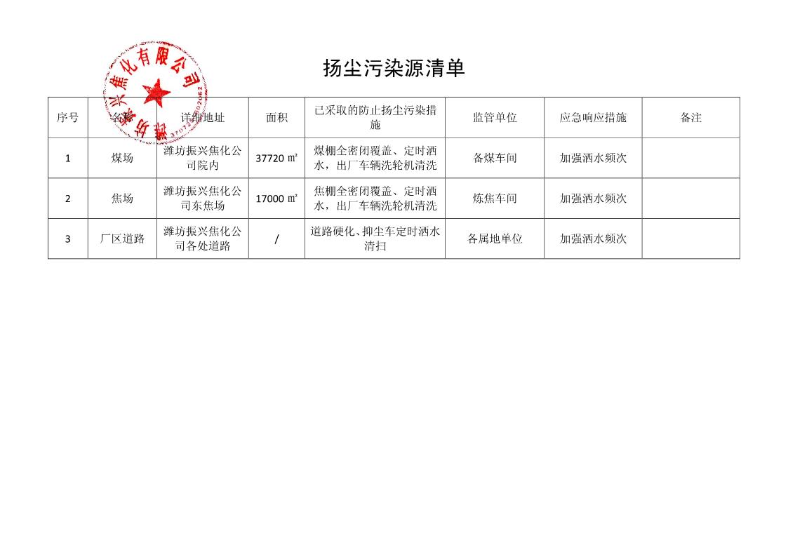 濰坊振興焦化有限公司揚塵污染源清單