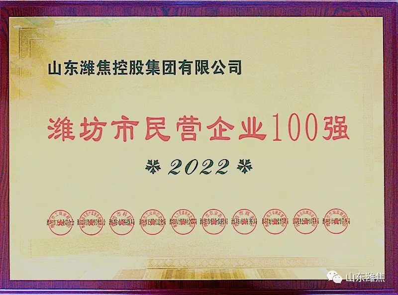 近日,由濰坊市工商聯、國有資產監督管理委員會、工業和信息化局、農業農村局、商務局、稅務局、市場監管局等機構共同發布2022濰坊民營企業100強,山東濰焦控股集團有限公司再次上榜,位列第8位!